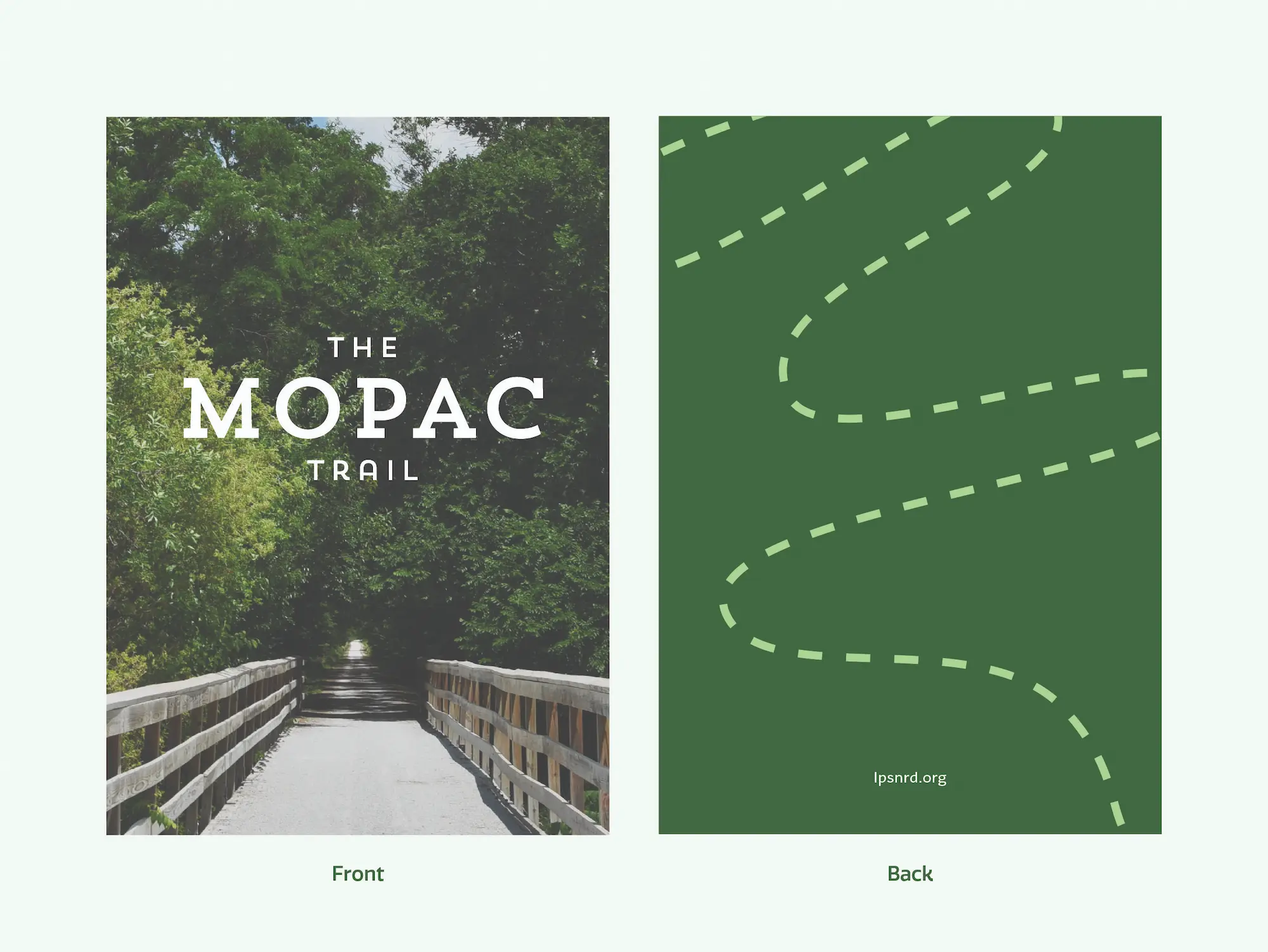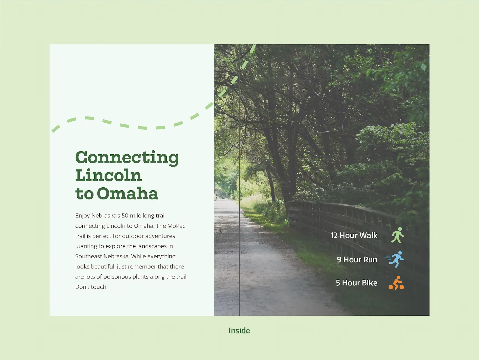The MoPac Trail helps people experience the outdoors and the natural beauty of Nebraska, so I used natural colors and images throughout my design to help people envision what the trail is like. I took pictures of the trail and the landscape around it, which are used throughout the materials. Throughout the design, I used a dotted line to represent the trail and to connect the content from piece to piece. In the booklet, it connects each page so someone reading it can follow the line as they flip through the book.