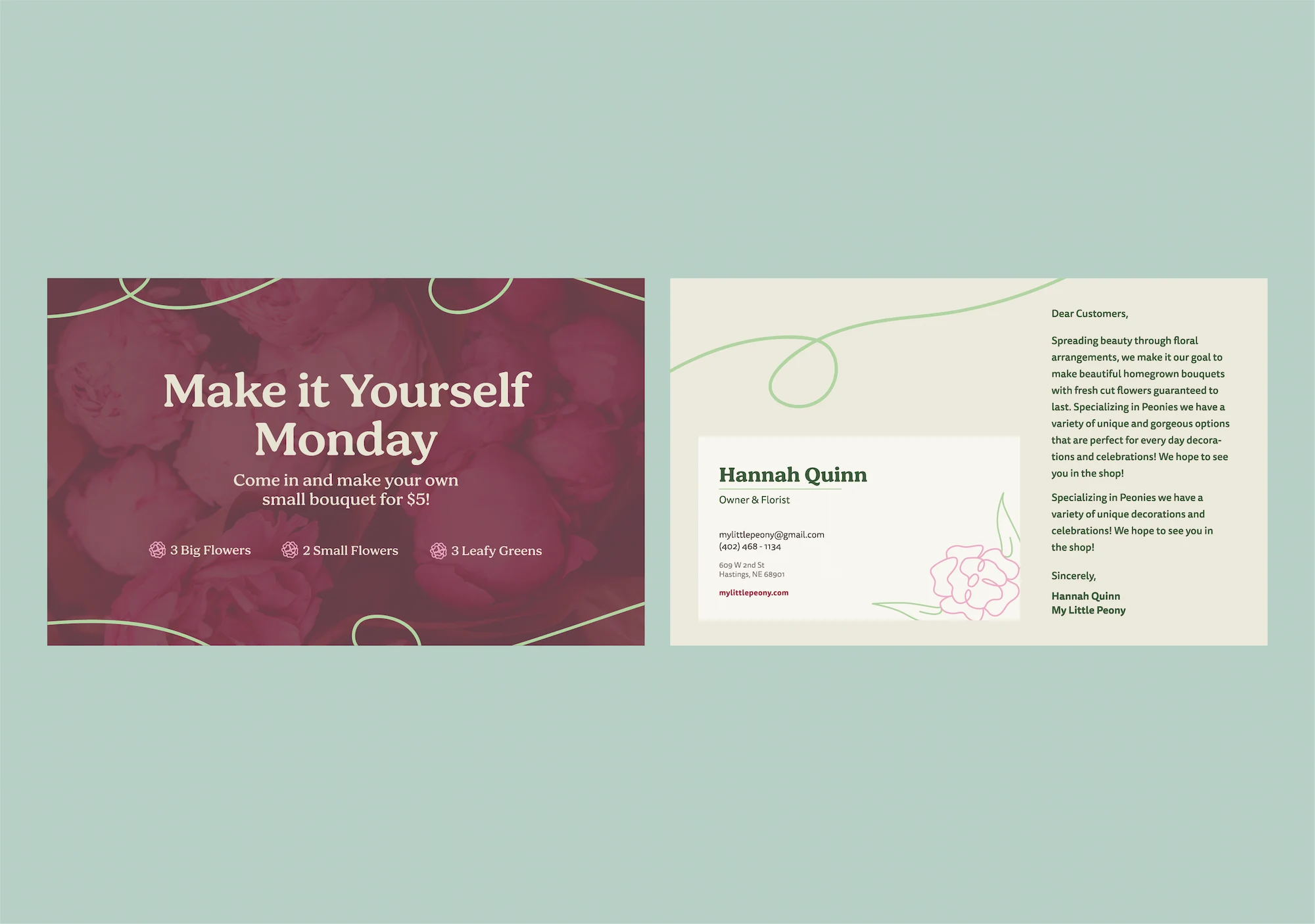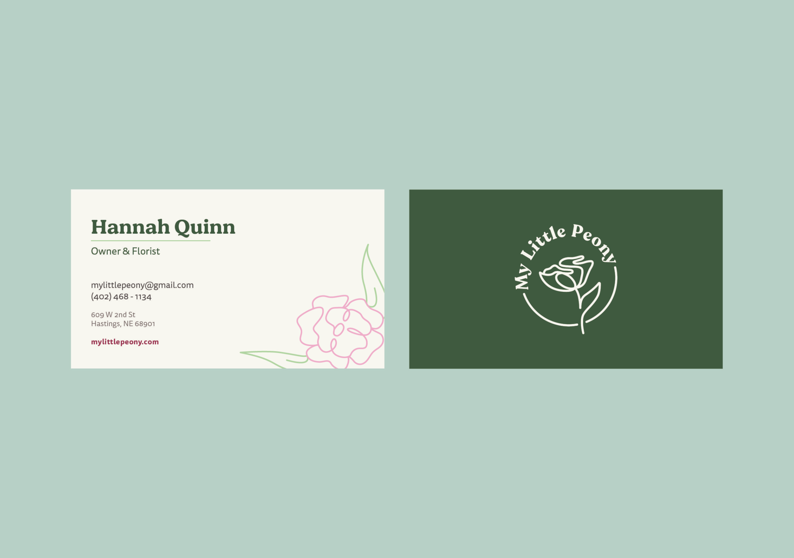 My Little Peony is a new local floral shop in Hastings, Nebraska, whose mission is to spread beauty through floral arrangements by specializing in peonies and making bouquets. They pride themselves on providing beautiful homegrown floral arrangements with big fresh flowers guaranteed to last. As a new shop, they not only need a visual identity system but promotional materials to introduce themselves to their community.
